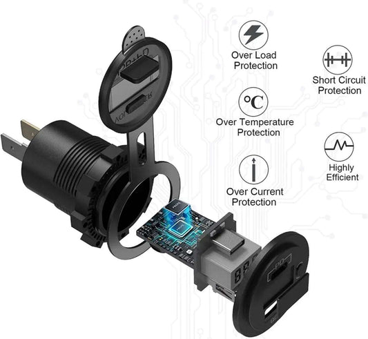 18W 12V/24V fast charger Dual USB / C socket PD3.0 & QC3.0 LED voltmeter, on/off switch